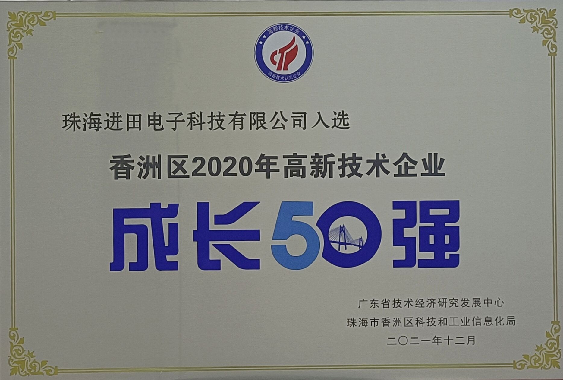 热烈祝贺珠海进田电子科技有限公司荣获珠海市香洲区2020年高新技术企业成长50强!
